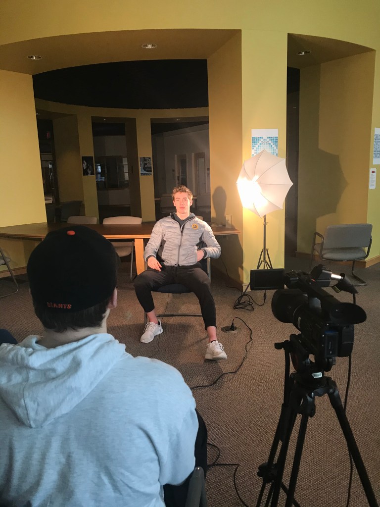 The project timeline was honestly something that went by pretty smoothly. After deciding on who we were going to interview which only took a few minutes we decided that Sunday would be the best day to film as both of us had no classes and I had no hockey on that day. After that I was able to arrange a time that worked with Skyler and we would all meet at 12pm at the communication building. We were able to get set up in around 45 minutes as we had a little bit of trouble with the lights but were able to figure it out. After that we filmed a couple of times and then would edit our work at the next class. Once done editing we were finished making our interview and were super excited to share it the next class.